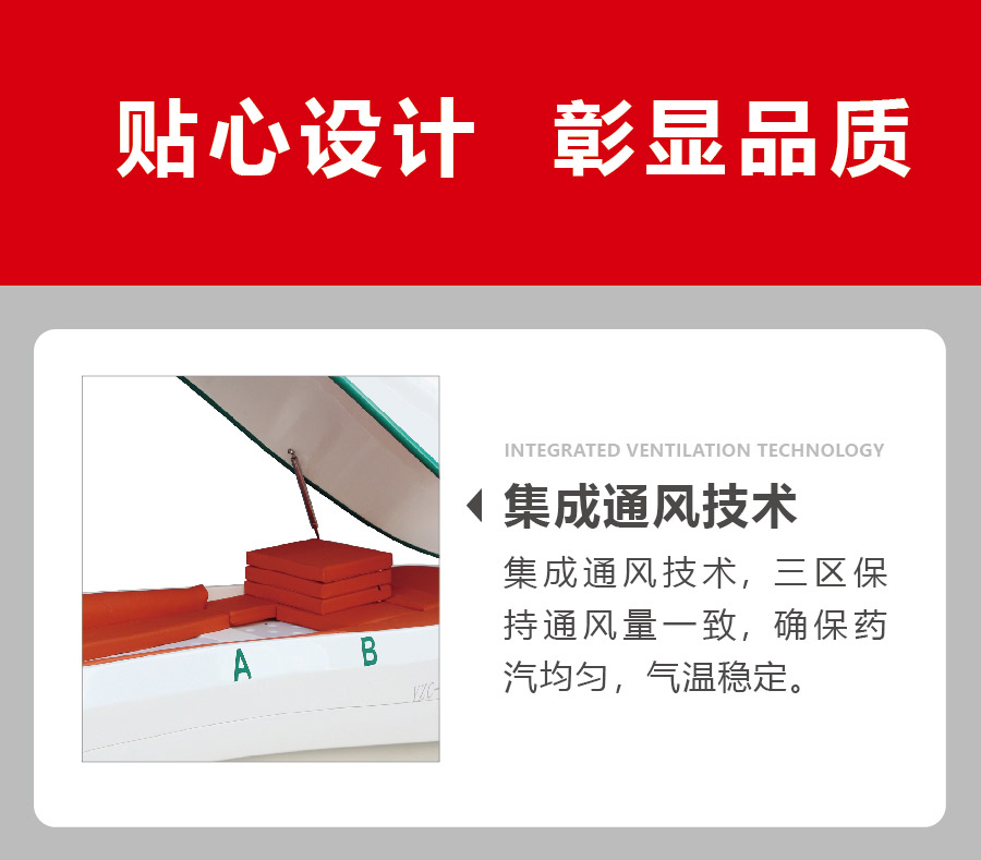 該產(chǎn)品為多部位自動中藥熏蒸治療器,在原有的基礎(chǔ)作了改進(jìn),有獨(dú)立三溫區(qū)控制功能。采用進(jìn)口食品級玻璃鋼床體,造型美觀大方,可單獨(dú)分塊拆分便于維護(hù)。整機(jī)一體化設(shè)計,無需中間連線,減少了占地空間,易于操作。配套熏蒸外罩減少藥氣流失。獨(dú)立三溫區(qū)控制恒溫,可同時使用或獨(dú)立組合使用,兼顧頸肩、腰臀、下肢熏蒸區(qū)域的組合。